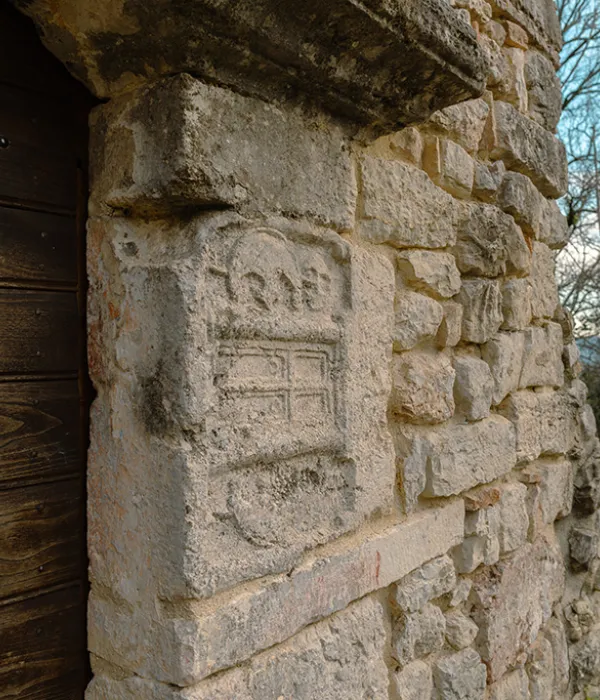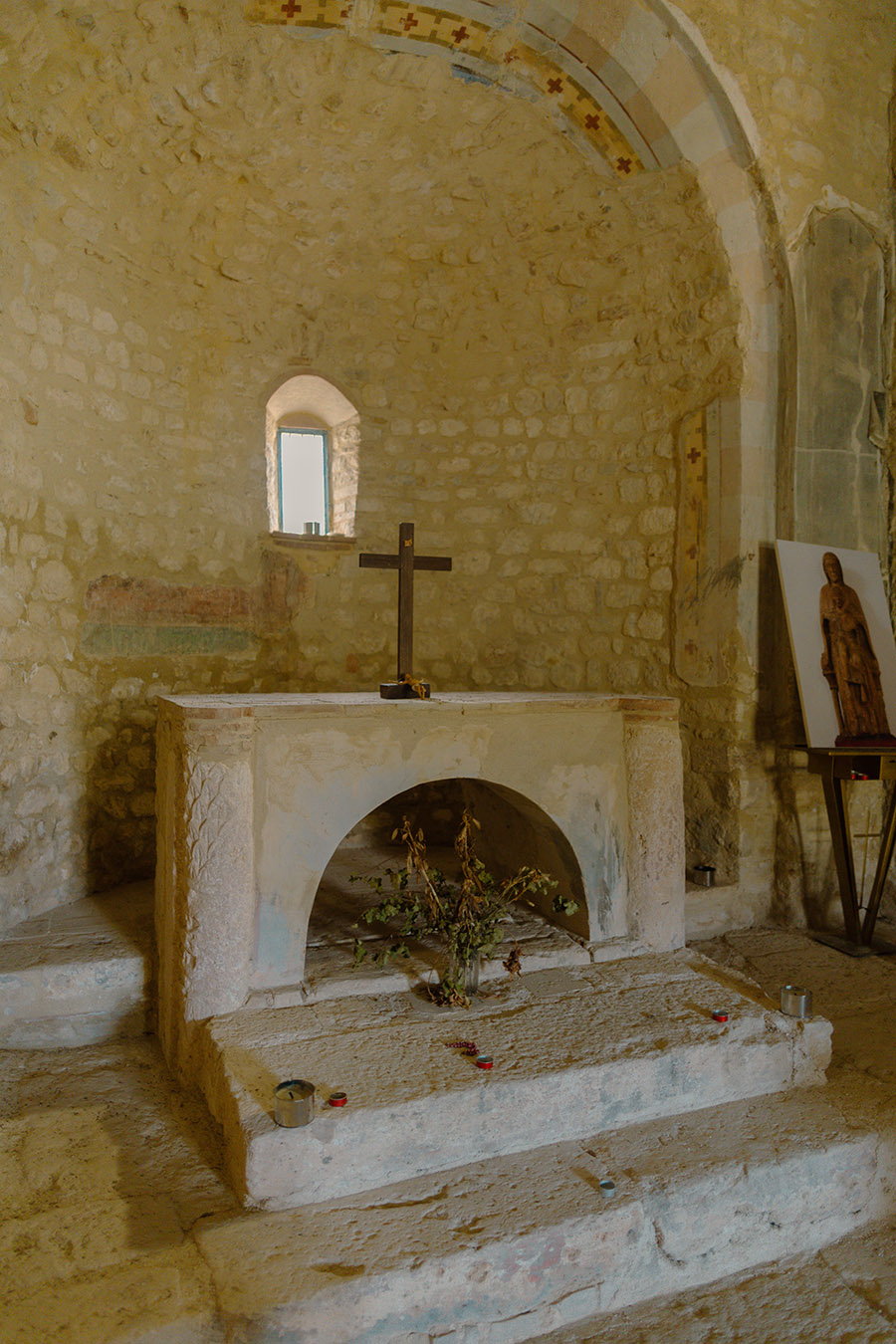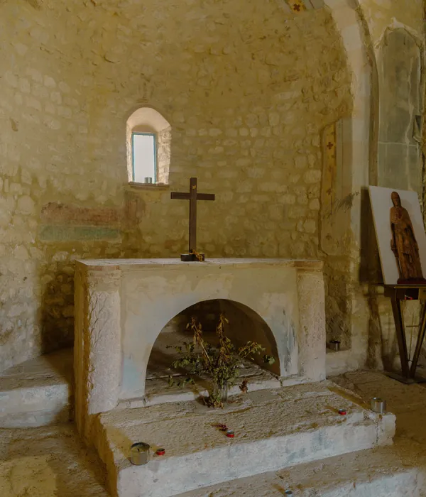 Sulla parete di destra dell’edificio più antico, circa due metri al di sotto del piano di calpestio, si nota una porticina murata, per cui forse la chiesa era provvista di una cripta.
