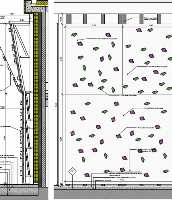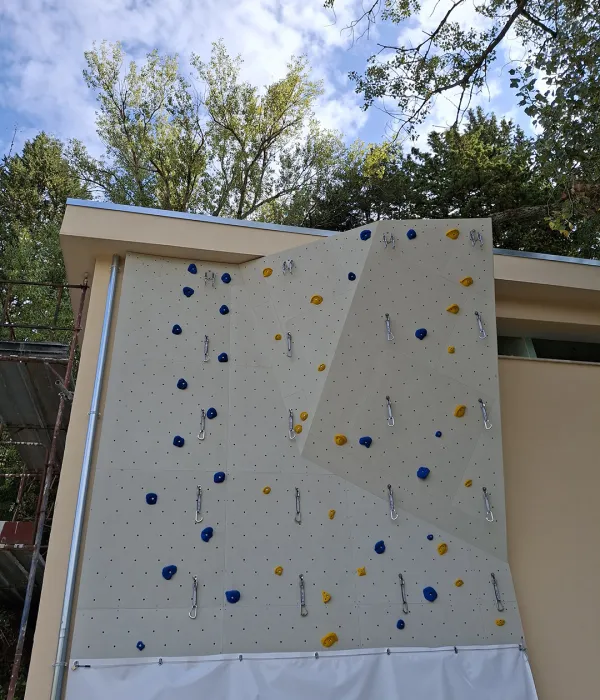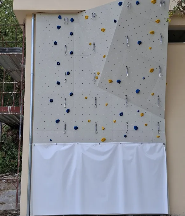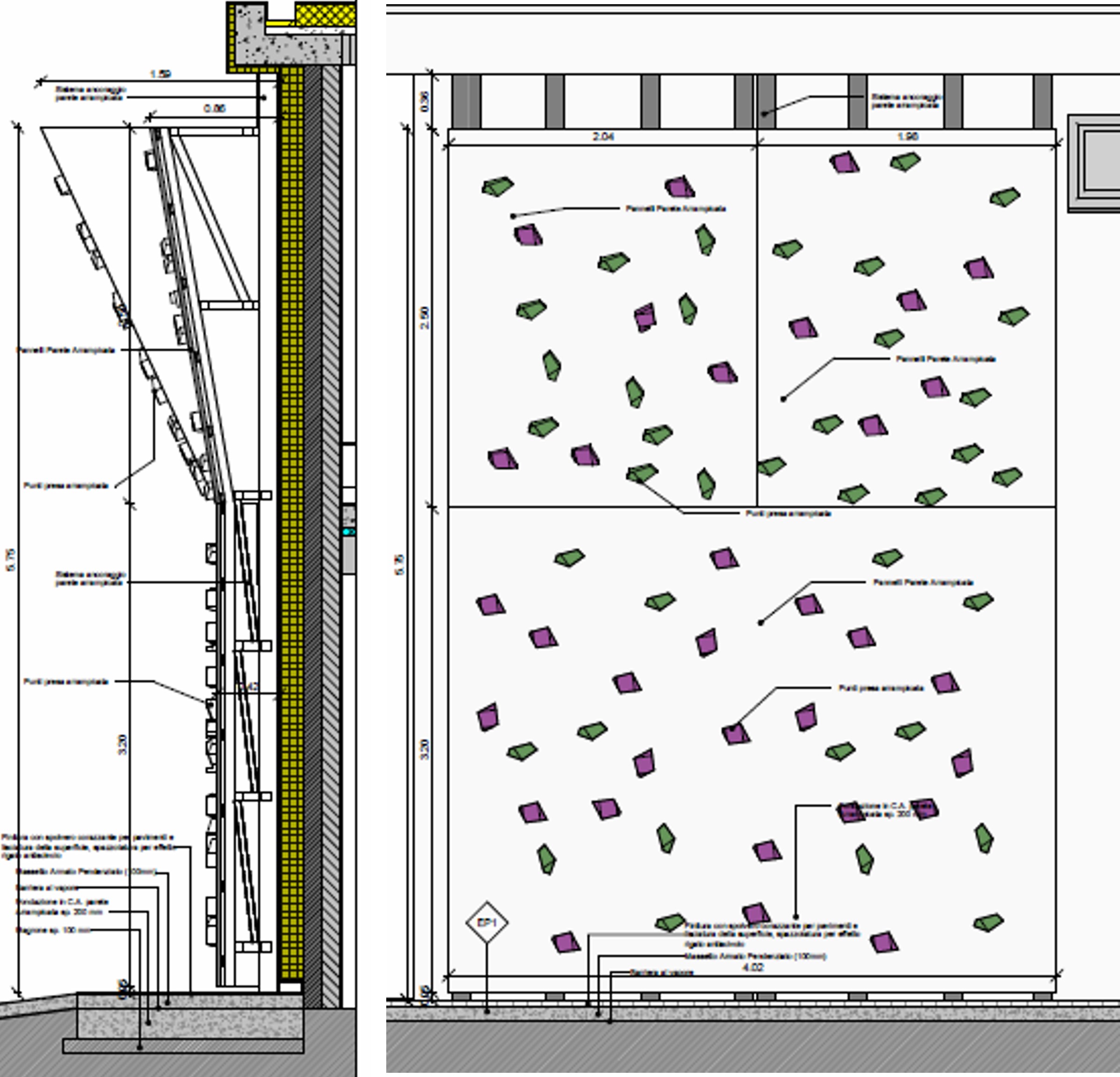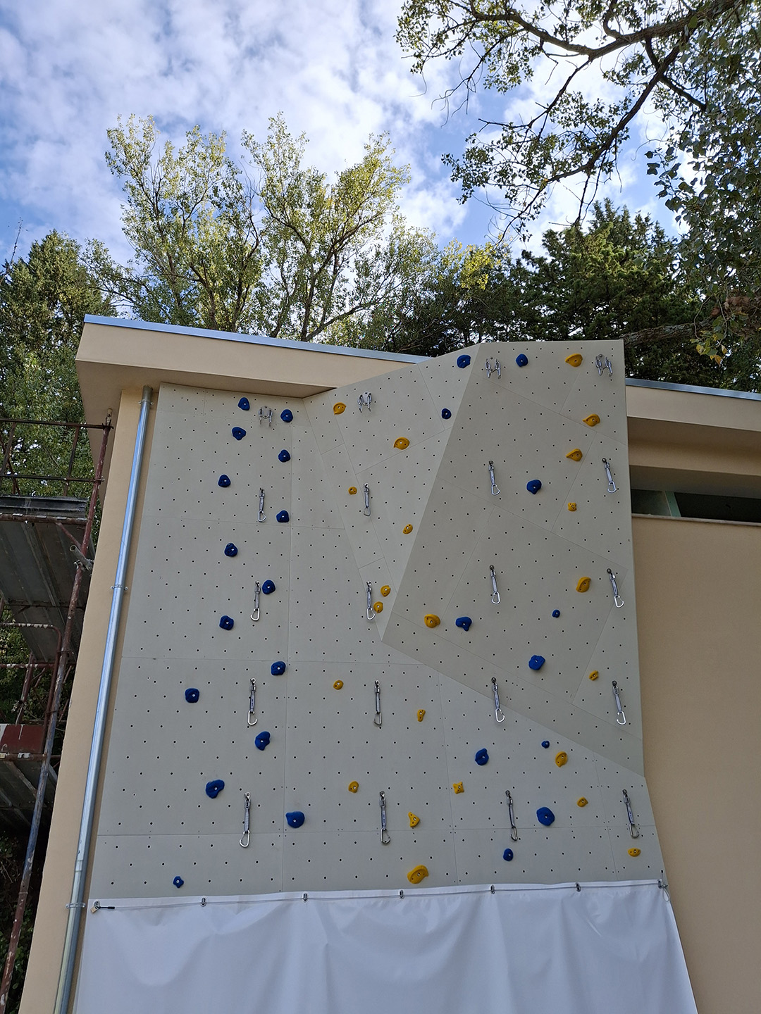 Struttura portante, realizzata in acciaio zincato a caldo, fissata alle pareti in muratura dell’edificio spogliatoi alla quale verranno assemblati i pannelli per arrampicata, attraverso apposite strutture reticolari che conferiscono il profilo.