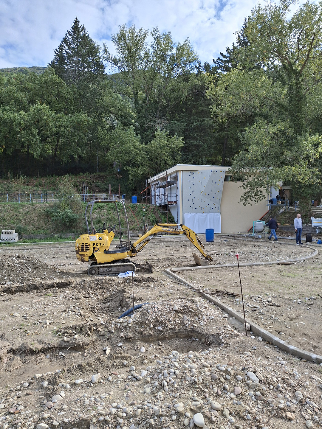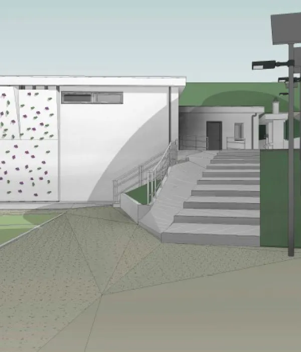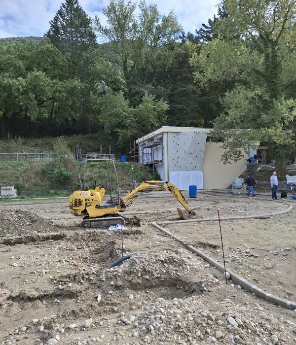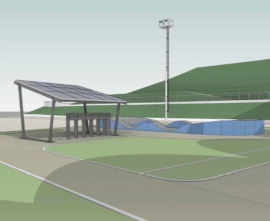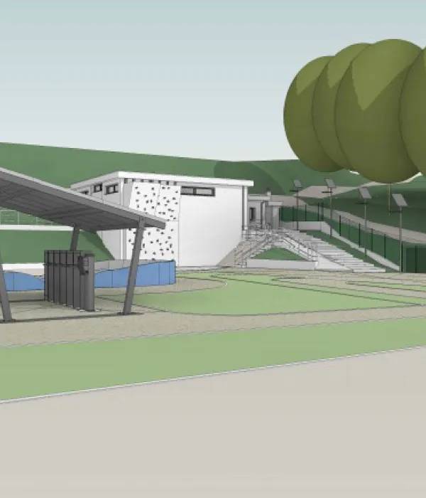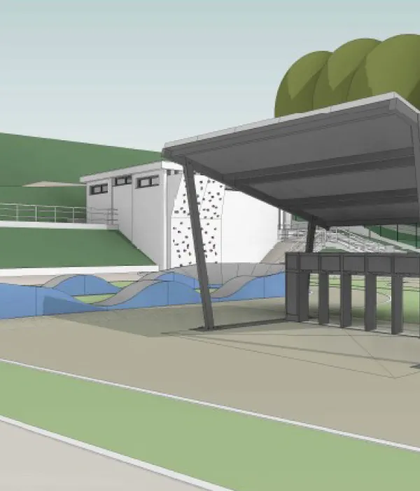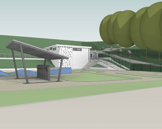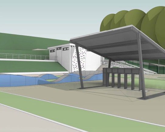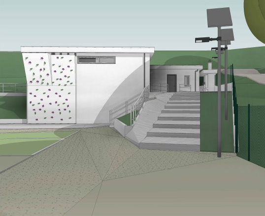 Struttura portante, realizzata in acciaio zincato a caldo, fissata alle pareti in muratura dell’edificio spogliatoi alla quale verranno assemblati i pannelli per arrampicata, attraverso apposite strutture reticolari che conferiscono il profilo.