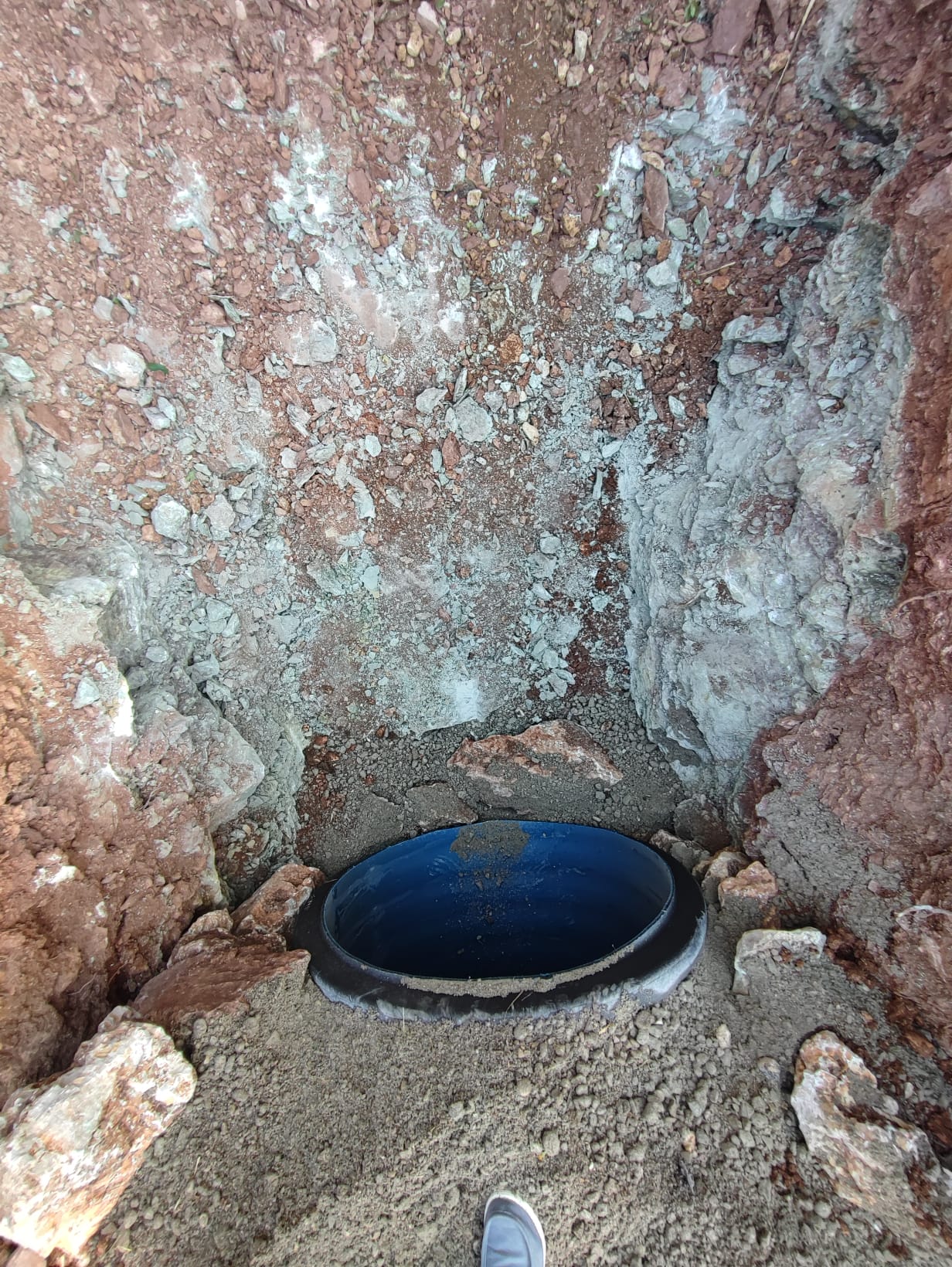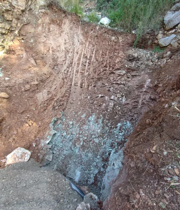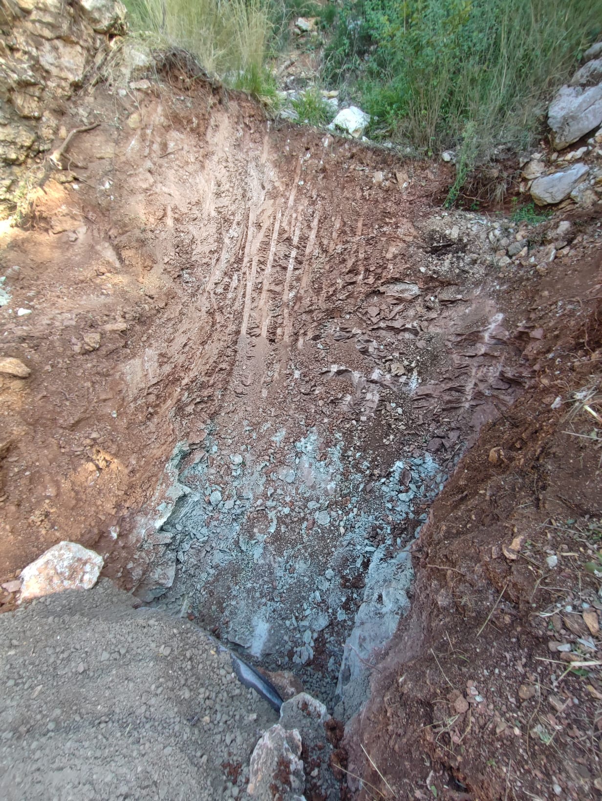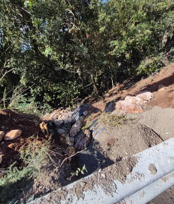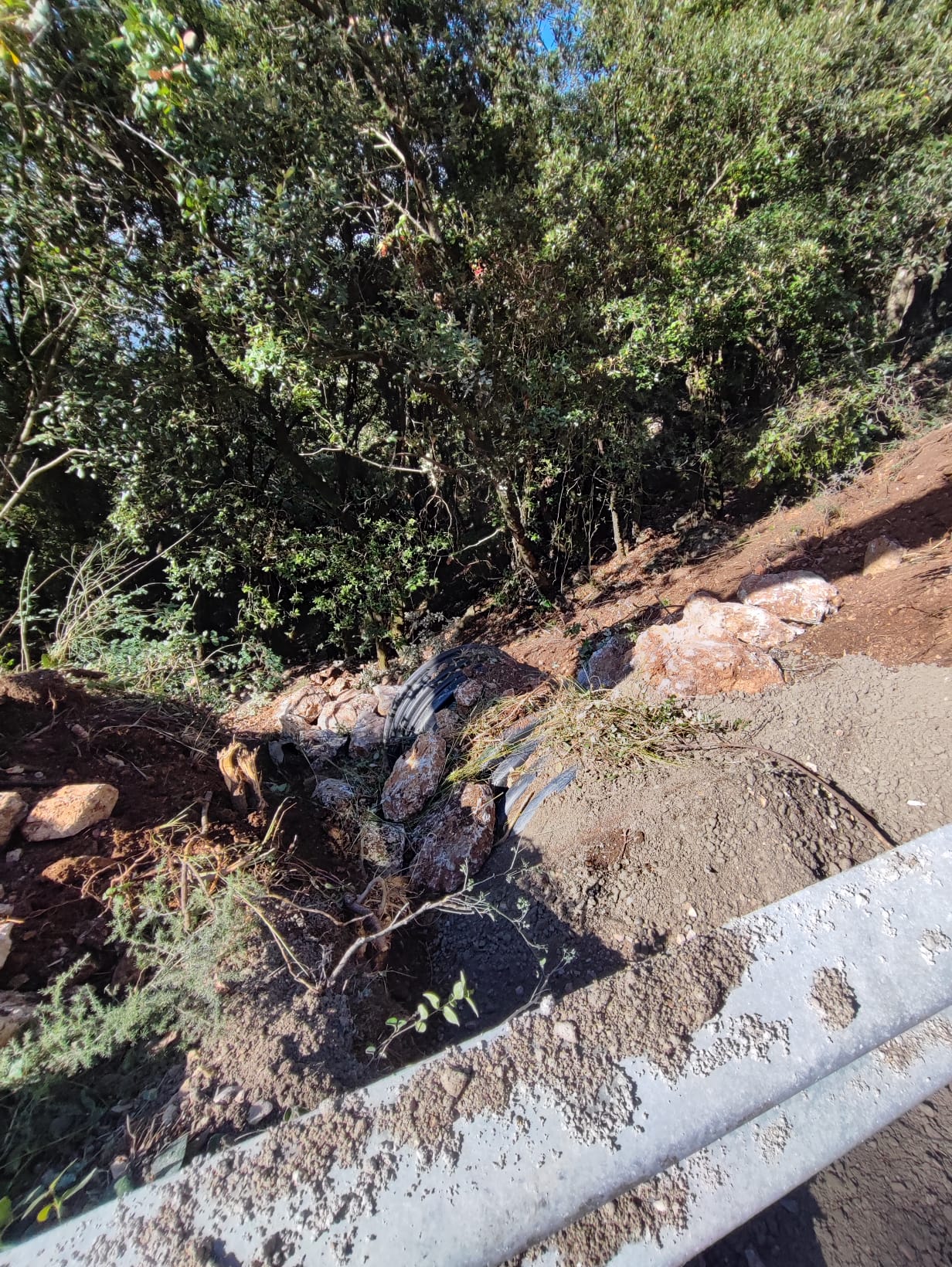 Inoltre è stato eseguito il primo scavo trasversale per canalizzare le acque meteoriche in corrispondenza di un compluvio naturale che, sino ad oggi, convogliava la pioggia sulla sede stradale.