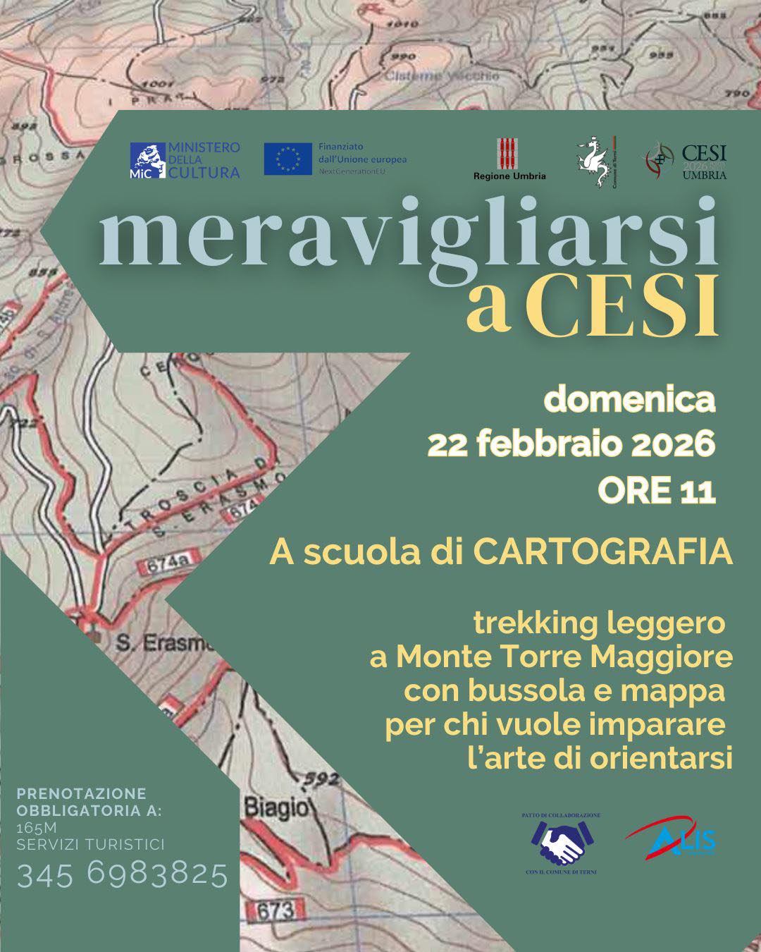 18.2.2026 - Domenica 22 febbraio alle 11 a Cesi è in rogramma un nuovo appuntamnto con "Meravigliarsi a Cesi", il ciclo d'incontri e di escursioni organizzate dalla cooperativa Alis nell'ambito del patto di collaborazione del progetto "Cesi Porta dell'Umbria". Si tratta - dicono gli organizzatori - di un appuntamento speciale per chi ama la natura e vuole imparare a leggerla davvero! Ci sarà inftti una vera e propria lezione di cartografia sul campo, con un’esperienza di trekking leggero a Monte Torre Maggiore dedicata a chi desidera scoprire l’arte dell’orientamento.