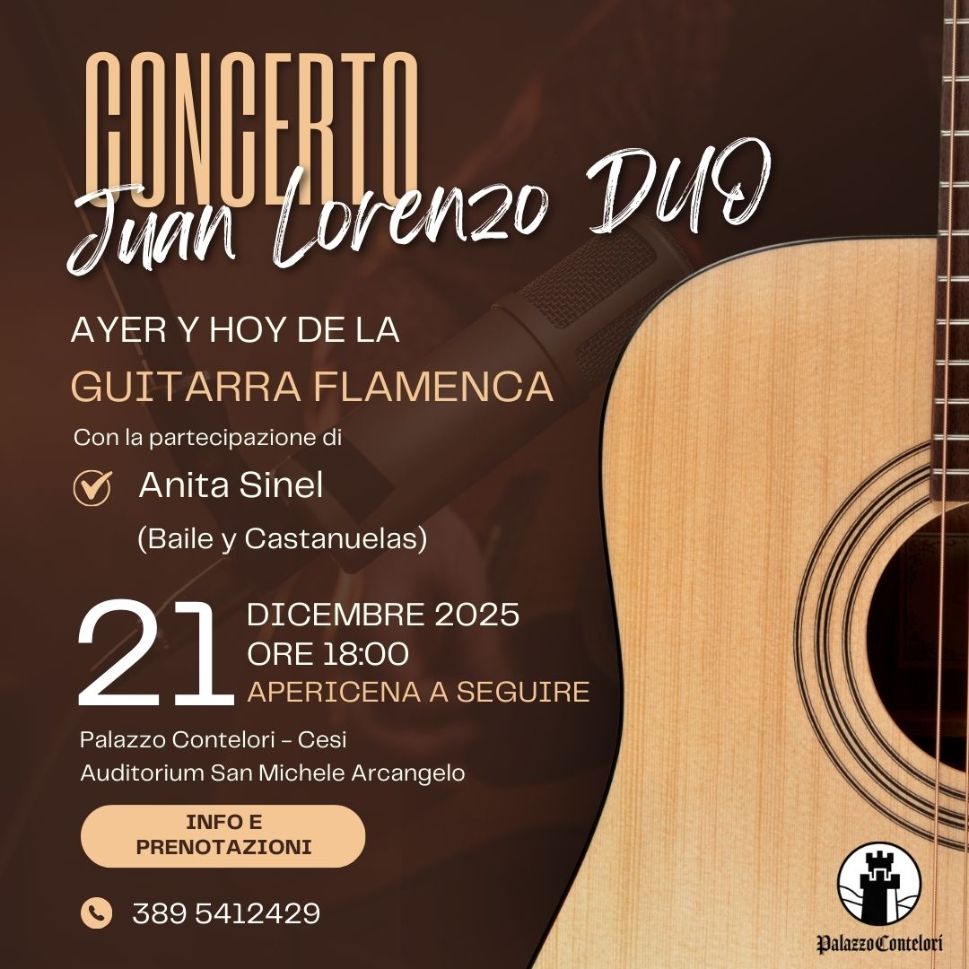 Domenica 21 dicembre alle ore 18, sempre nell’auditorium di Sant’Angelo, a cura della Filarmonica Cesana, è in programma il concerto di Juan Lorenzo Duo “Ayer y Hoy de la Guitara Flamenca”, un viaggio musicale affascinante tra tradizione e modernità della chitarra flamenca da concerto. Il programma comprende composizioni ispirate allo stile dei grandi maestri del concertismo flamenco e alcuni brani saranno arricchiti da coreografie, per un’esperienza coinvolgente tra musica e danza. L’ingresso è gratuito.