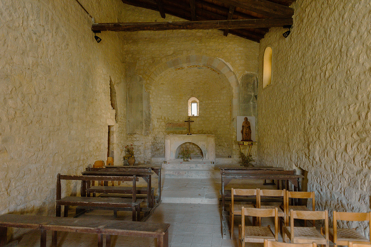 L’interno è a navata unica, spoglio e disadorno; ai lati dell’altare sono affrescati San Benedetto e un santo non identificabile, unici resti dell’antica decorazione pittorica.