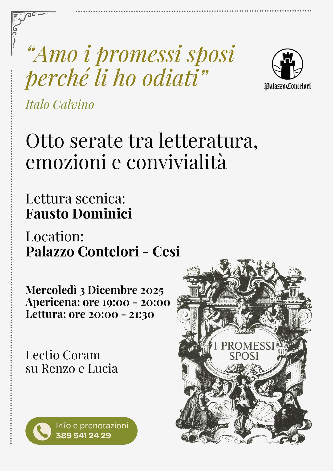 27.11.2025 - Mercoledì 3 dicembre è in programma a Palazzo Contelori, un nuovo incontro del ciclo dedicato ai Promessi Sposi, con il titolo "Amo i promessi sposi perché li ho odiati" - Otto serate tra letteratura, emozioni e convivialità.