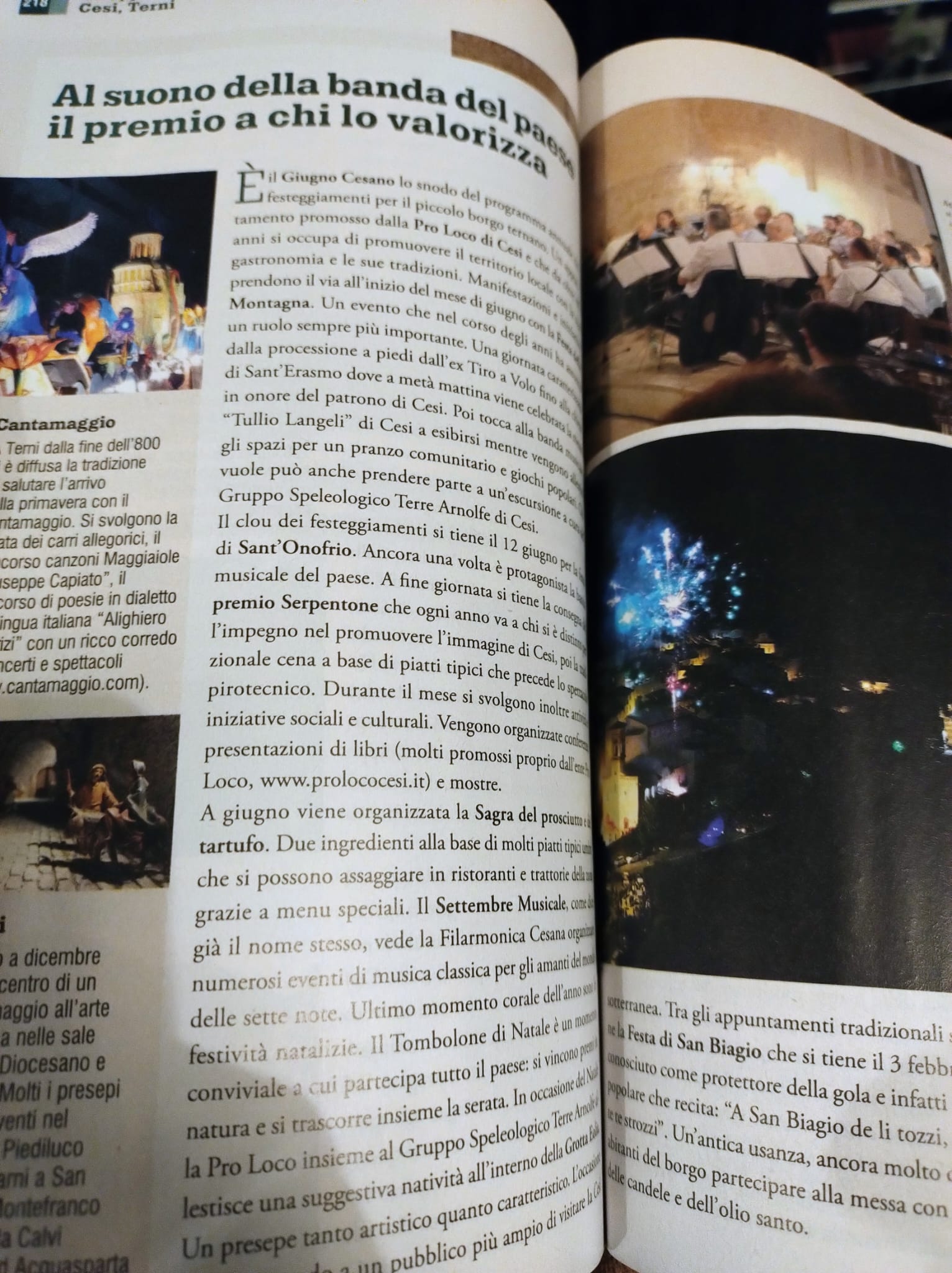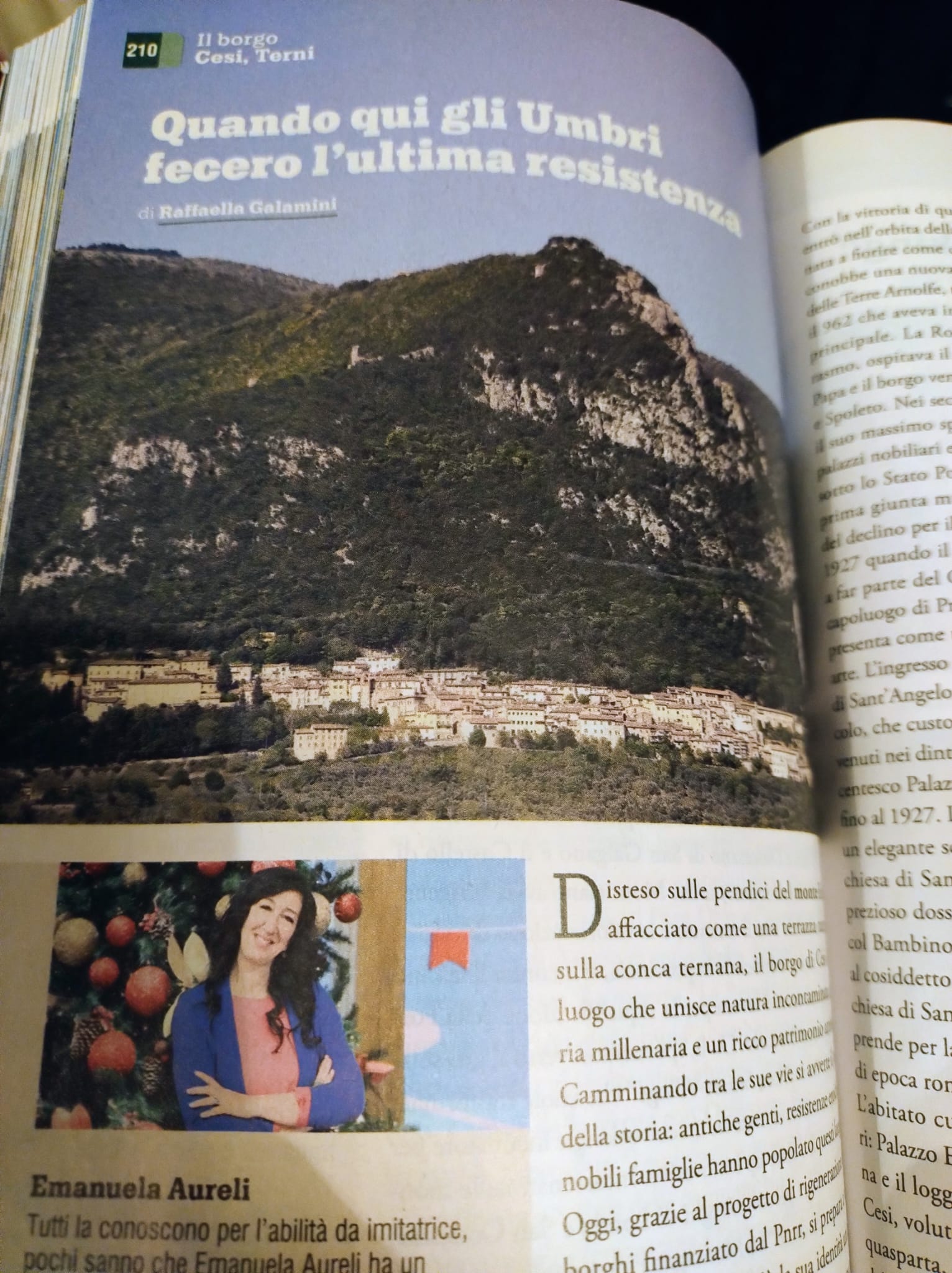 19.11.2025 - Con quindici pagine d'informazioni, curiosità e immagini, la guida di Repubblica "Piccoli Borghi d'Italia: le meraviglie di un mondo sconosciuto", ha reso omaggio al paese di Cesi. La guida, ancora in edicola, è dedicata ai 21 Borghi candidati dalle Regioni e finanziati dal Ministero della Cultura per l'ambizioso progetto nell'ambito del Pnrr legato alla Linea A del bando Borghi. Nel capitolo su Cesi sono state messe in evidenza la ricca storia, la stupenda posizione del paese, insieme al nuovo ruolo di "Porta dell'Umbria" e dei monti Martani. Inoltre i curatori della guida si sono soffermati sulle aree archeologiche e su tutte le opportunità offerte per gli sport outdoor nell'area di Cesi e delle sue montagne. Ci sono poi riferimenti alle tradizioni e alle leggende di Cesi, dall'ipotesi del rifugio degli antichi Umbri nelle grotte del monte Eolo, fino alla festa della montagna e del patrono Sant'Onofrio, nell'ambito del Giugno Cesano. Molti i riferimenti all'olio d'oliva e perfino ai piatti tipici come le strappatelle. Un pezzo a parte per l'Accademia della Bruschetta, con tanto di citazione di una poesia in vernacolo di Frumenzio. Per Cesi e per il suo progetto di rigenerazione un'altra occasione per iniziare a farsi conoscere a livello nazionale.